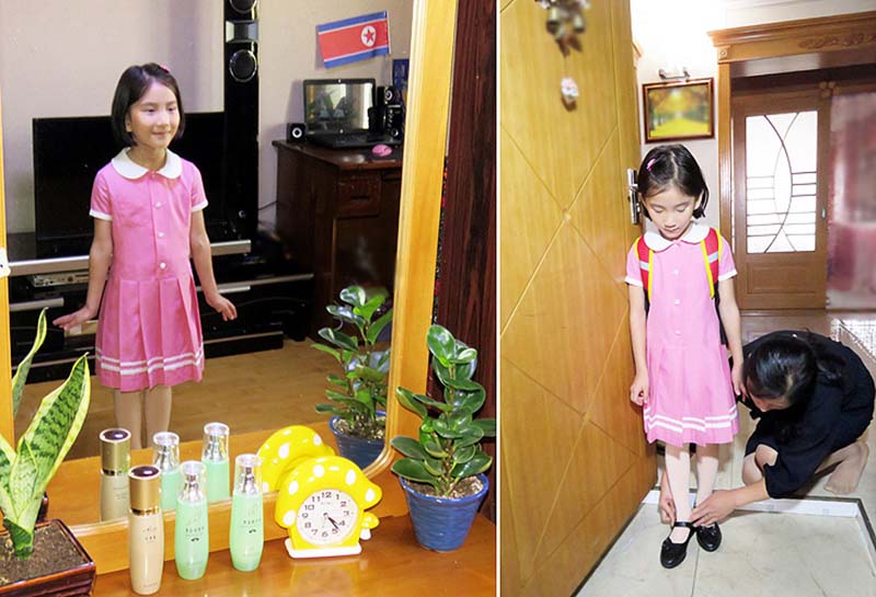 制服、鞄供給新しい風景共和国の永遠の国策(制服生産)正月に見た新しい制服のサンプル新しい制服姿の生徒たちと共に朝鮮労働党の重大な革命事業