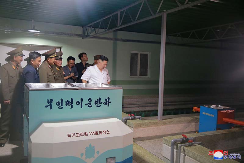 この日、工場の各所を見ていた総書記が屋内のスッポン養殖場に寄った時のことでした。総書記は、養殖場に設置された無人飼料供給機に近寄りました。無人飼料供給機には、「国家科学院第111号製作所」と書かれていました。