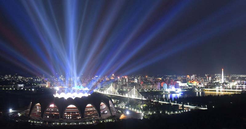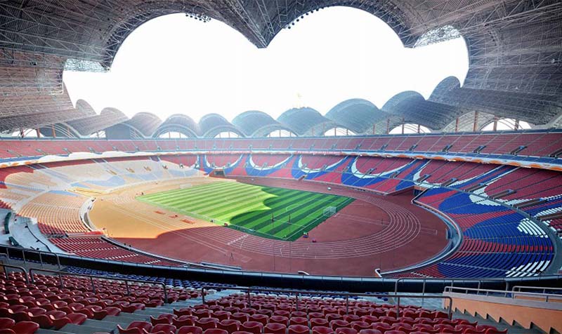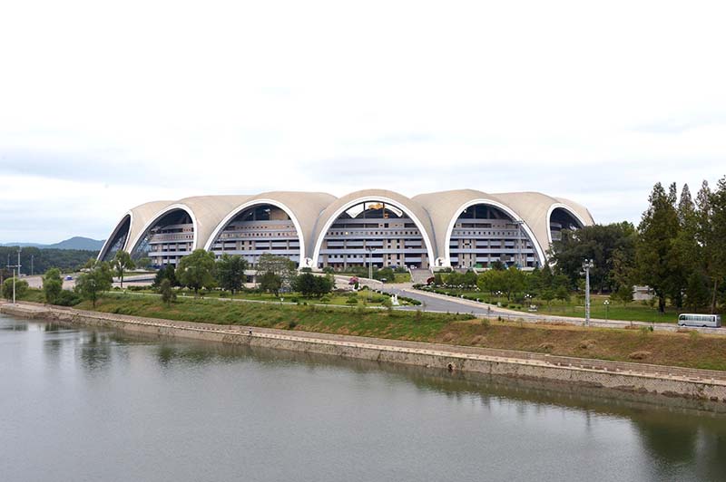 ピョンヤンの風光明媚なルンラ島*1にはメーデースタジアム*2があります。チュチェ78(1989)年5月1日に竣工したこのスタジアムは、軽快で立体感のある設計で完成されました。スタンドは15万席です。