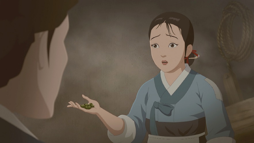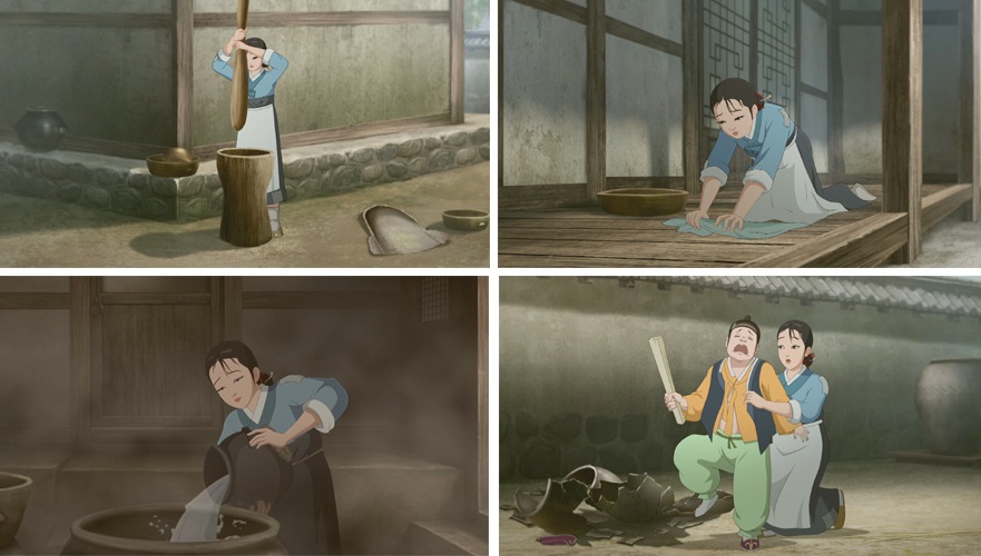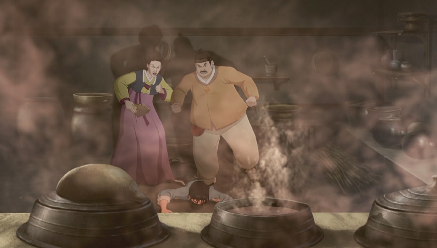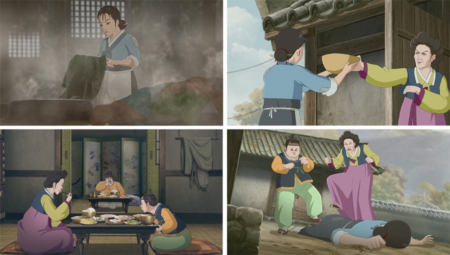 しかし、翌日からポムスンの苦役が始まります。地主の妻はポムスンに少量の米を与え、食事を準備させたあと、自分たちは腹いっぱいに食いながらポムスンには釜の底に焦げ付いたご飯まで与えず、袋叩きにします。親の借金をすべて免除するとの地主の言葉を信じて耐え忍んでいたポムスンは余りにも辛くて真夜中に裏山に上ります。