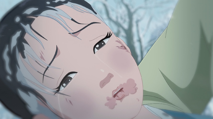 そして、ポムスンを袋叩きにしたあげく、熱い粥を強引に口に入れた後、家から追い出します。酷寒に耐えかね、ポムスンはミヤママタタビのある裏山に登ろうとして力が尽きてしまい、倒れます。