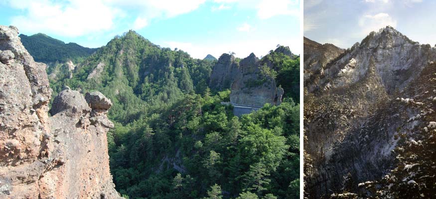 クムガン峰の中腹の岩の隙間から松、かえで、朝鮮にわうめの木が育ち、四季を通して美しい色を付けますが、岩肌が露出したところも多くあります。