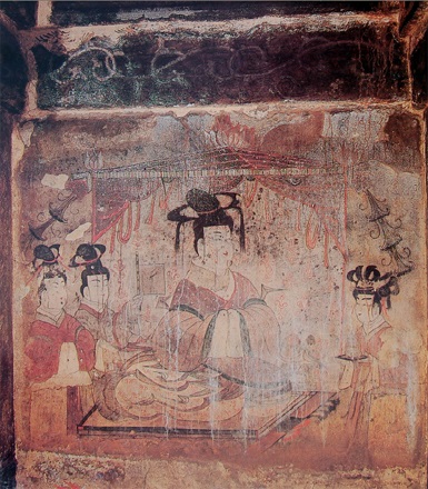 王妃も侍女を従え、腕を組んでいます。入り口の左右には武士が剣を握って立っています。 玄室の東のほうの部屋には台所と肉類貯蔵庫、井戸、穀物を臼でつく所、家畜小屋などが描かれています。