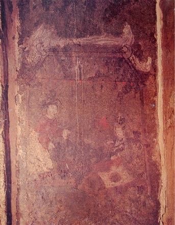 玄室の西のほうの部屋には王と王妃が描かれています。主人公はコグリョで王だけが使ったと言う白い冠をかぶり、華麗な絹の服を着て幕が張られた部屋に座り、家来の進言を聞いて何かを言いつけています。