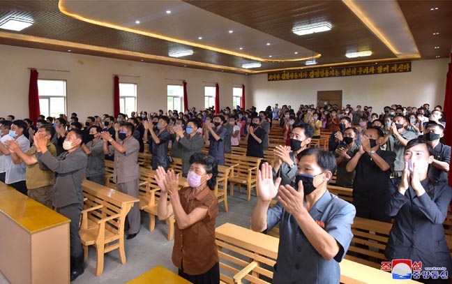 「寝てもさめてもお会いしたい懐かしい金正恩元帥様。この8月5日、思いがけなくも大水により、家屋と家産を失って路頭生活を余儀なくされ、その心配で夜を明かしたテチョン里の住民みなが今は喜びと幸せに満ちて眠れず、元帥様に感謝感激の思いを込めて深々とお辞儀をしたく、このように一堂に会しました・・・」