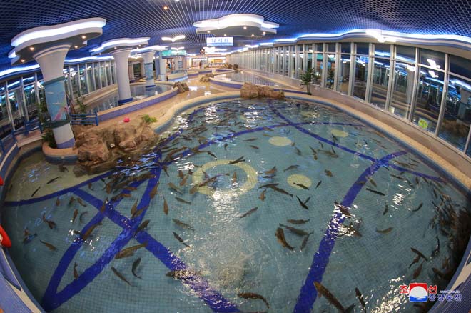 食堂の内部は、各要素がとてもユニークで精巧なつくりです。食堂は3階建てですが、多様な形式の食事室と共に、1階には各種の淡水魚と海水魚の室内水槽があり、2階には加工品のコーナーもあります。食堂では、生魚で作った美味しく栄養価の高い水産物の料理と加工品を売っています。