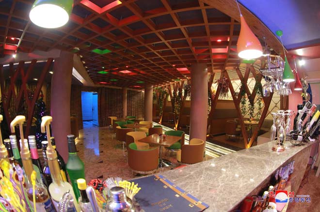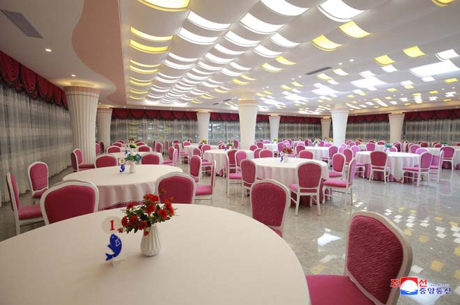 「食堂のサービスに満悦する人たちを見る度に、忘れえぬその日のことが思い浮びます。2018年6月8日の夜、敬愛する最高指導者金正恩委員長が竣工を控えた食堂を訪れました。まるで夢のようでした。食堂を眺めながら金正恩委員長は、わが国に建てられた大衆向けのサービス施設の中でオクリュ館が20世紀の代表作だと言えば、ピョンヤン・テドンガン水産物食堂は21世紀の代表作だと言えるとし、とても喜びました。そして、1階から3階まで食堂全般を見て、水産物の料理の質に格別関心を払い、来客が些細な不便も感じないよう、きめ細かく繊細にサービスしなければならないと強調しました。金正恩委員長は、テドン川*2の辺のもってこいの場所にまた1つのサービス施設が建てられて人民がとても喜ぶだろうと言いました」