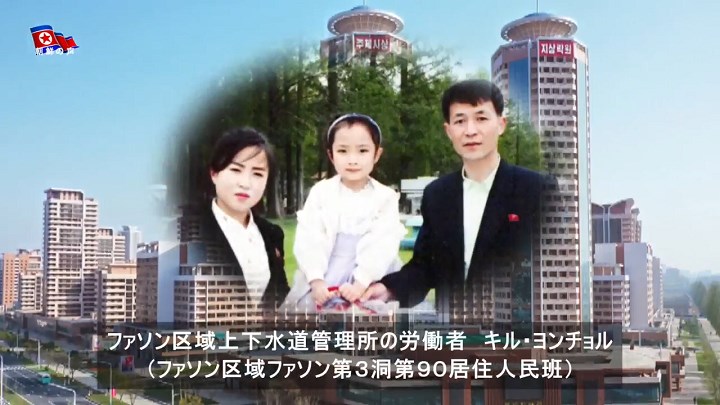 私は引っ越す前にチャンジョン通りで両親と一緒に暮らしていました。11年前にチャンジョン通りが建ったとき、誰もがそこに住む人たちをとても羨ましがりました。それが、今度、大学を卒業して上下水道管理所に配置されて、思いがけなくも素敵な家を貰いました。夢にも思っていなかったことです。私のような幸運児がいましょうか。そうして、両親はチャンジョン通りに住み、私の家族はファソン通りに引っ越しました。他の国では、巨額のお金がないと家を買えないといいますが、わが国では普通の勤労者が国家から無料で家をあてがわれます。今から社会生活を始める私がこのような配慮を受けて、どう報いようかと思っています。他人より何倍も精を出すつもりです。