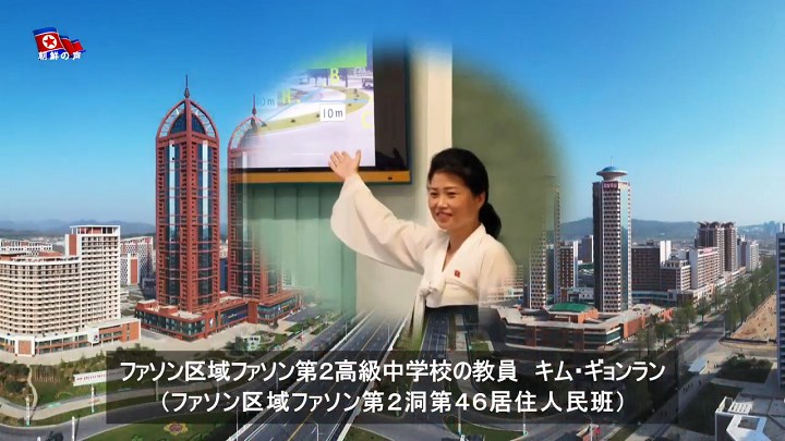 私たち教員がここに志願するとき、家をもらえるとは思いもよりませんでした。なのに、私の名による入居証書を貰いました。証書を貰うとき、あまりにも感激して泣いてばかりいました。証書を手にした瞬間、「金正恩総書記、ありがとうございます」と声を限りに叫びました。夫も子も眠れませんでした。今も「これ、本当に私の家かしら」と思うときがあり、職場から帰ると嬉しくてこの部屋、あの部屋を見て回るんです。入居証書を受けたとき、夫に一番最初に電話しましたが、どれだけ喜ぶのか、地方に住む母にも電話しました。母は、自分もできなかったことだと言って泣き、私も泣きました。母は健康で仕事に励むことで報いるのよ、と言いました。ファソン通りの第1世の教育者に押し立てて*2くれたことだけでもその信頼に胸がいっぱいなのに、総書記はファソン通りの生徒を立派に育てるように、と家をくれました。この大きな信頼を胸に、教育に全てを捧げる決心です。夫も、子も自分の本分を果たそう、それが恩に報いることだと言っています。