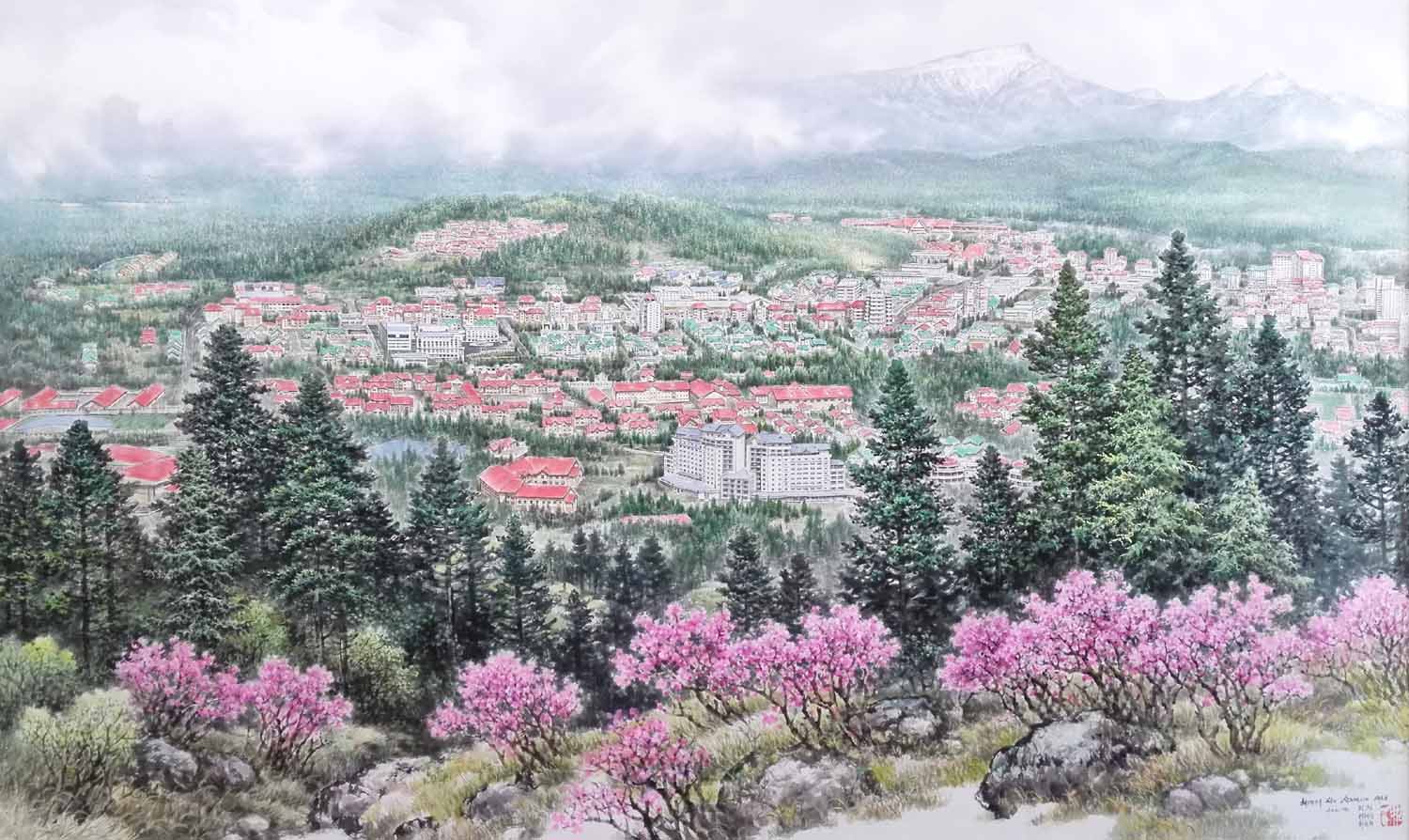 リさんは娘たちをアーチストに育て、末娘のリ・ヘソンさんは今、マンスデ創作社の朝鮮画創作団で父と共に創作に携わっています。2人が創作した朝鮮画「革命の聖地サムジヨン市の新しい姿」は今年2月に行われた光明星節記念全国美術祭典で1等賞を授かりました。