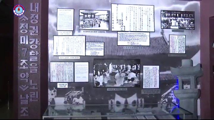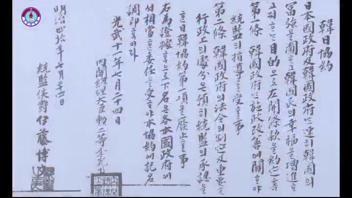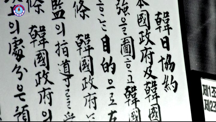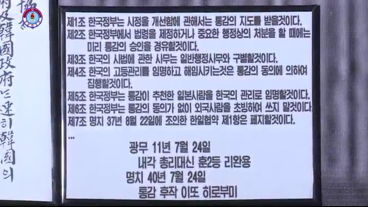 「当時、反日感情が強かったコジョン皇帝は日帝に唆された総理大臣なるリ・ワンヨンなどから『丁未7条約』の草案の批准を求められた時、許諾と署名、玉璽捺印の全てを断固拒みました。狡猾な日帝は、この『条約』を容易く捏造するためコジョン皇帝に退位を強い、無能な皇太子を皇帝のポストに座らせました。7月24日、売国奴のリ・ワンヨンの印を捺すだけで『条約』が締結されたかのように、『韓日協約』という名の下で公布してしまったのです」