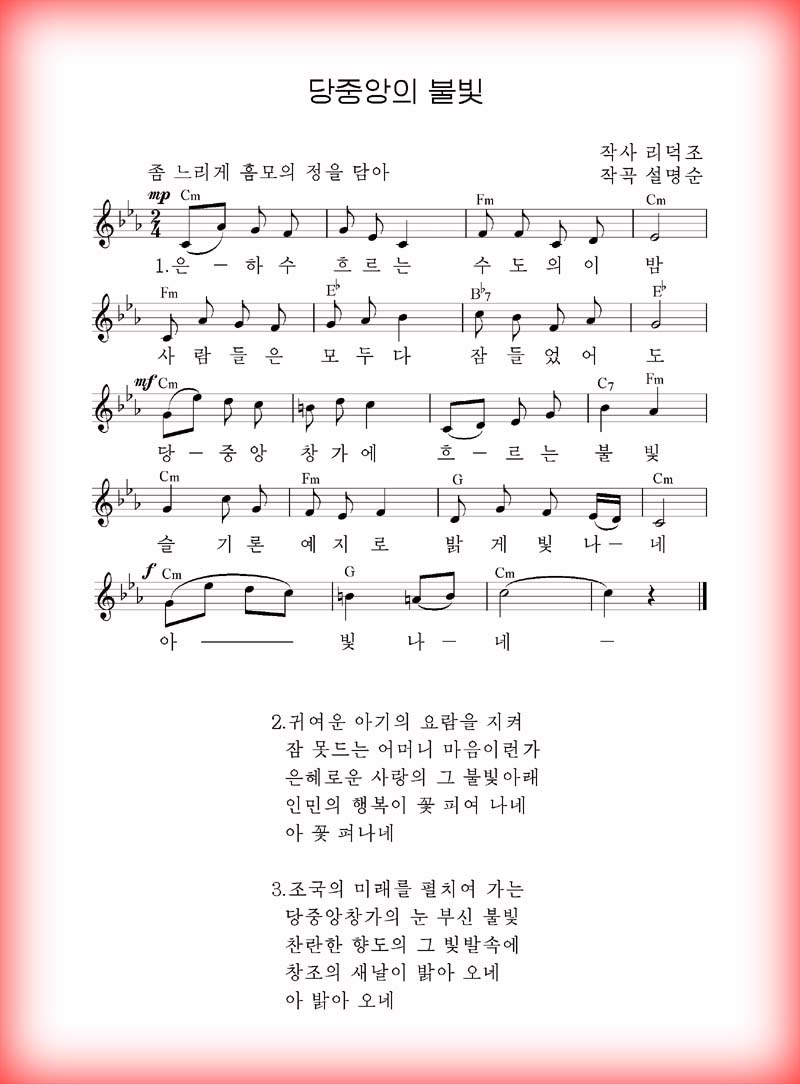 党中央の灯を通じて思想・理論の大家、人民の優しい父、創造と建設の英才である国防委員長の偉人としての風格と不滅の指導の業績を芸術的に立派に表しているところにこの歌の生命力があるのです。