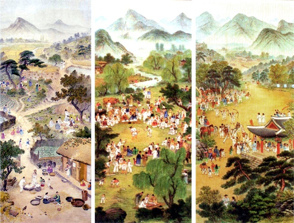 この日、男は相撲、綱引き、弓術、女はブランコ乗りなどでチュソクに彩を添えました。夜は、子供だけでなく、大人も家の庭や山へ登ったりして月見を楽しみながら、素朴な夢が込められている詩を詠んだり、歌を歌ったりしました。