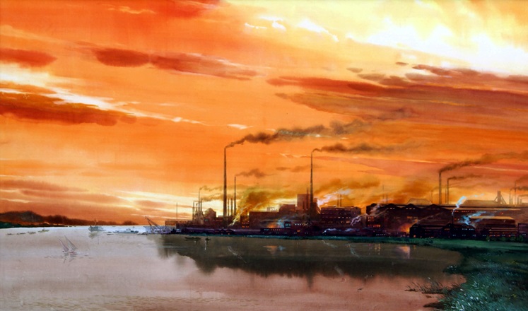 チュチェ61(1972)年、晩秋のある日のことでした。父は当時のカンソン製鋼所に行って見ましたが、夕焼けがとても美しく、それを見事に描けば優れた作品になれると言った総書記の言葉を伝え聞きました。父は創作の熱意で全身が燃え滾るようでした。製鋼所に行った父は1ヶ月間も夕焼けを観察し、草案を完成しては、戻って来て夜を日に次いで作品の創作に心魂を傾けました。