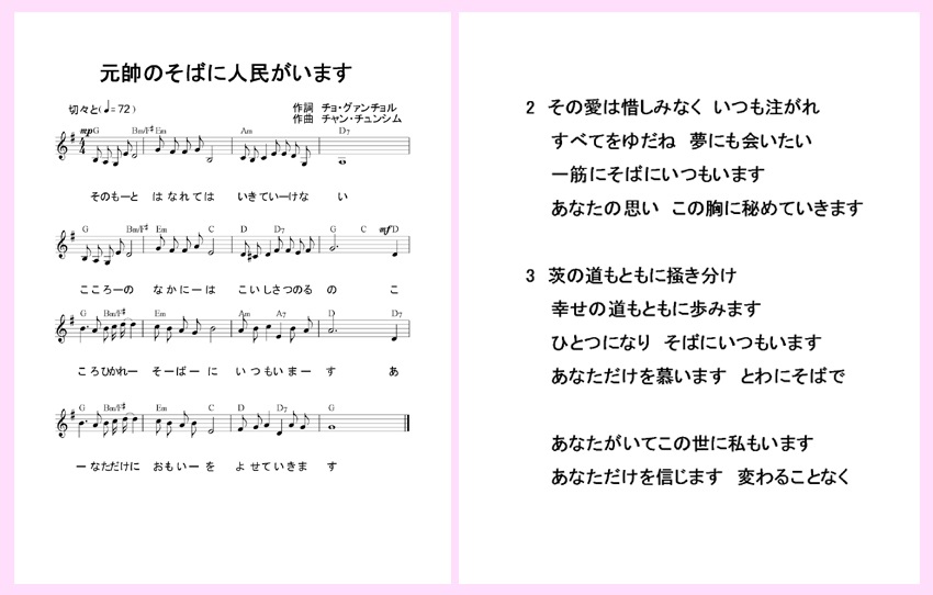 チョ・グァンチョル*1作詞、チャン・チュンシム*2作曲の「元帥のそばに人民がいます*3」、この歌は、チュチェ104(2015)年に出たものです。