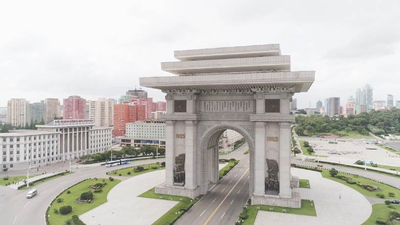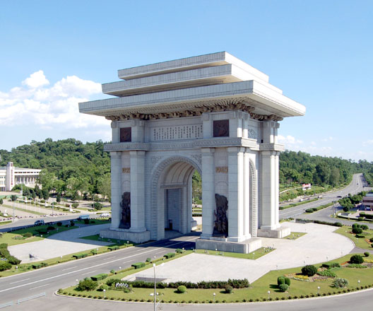 凱旋門は朝鮮を解放した偉大な金日成主席の不滅の業績を末永く伝える大記念碑です。チュチェ34(1945)年10月14日、偉大な金日成主席が凱旋演説をしたピョンヤンのモラン峰*1の麓に建てられています。主席の生誕70周年に際してチュチェ71(1982)年4月14日に除幕しました。高さ60メートル、間口50.1メートルの4階建ての石造建築です。