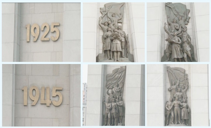 両側の壁面に「1925」、「1945」の年代が浮き彫りにされ、その下にはそれぞれ6人からなるレリーフ像が配されています。1925年は主席が革命活動を始めた年であり、1945年は朝鮮の解放を成し遂げた年です。レリーフ像は金日成主席を解放なった国に迎える朝鮮人民の喜びと新生活への熱い思いをリアルに表しています。