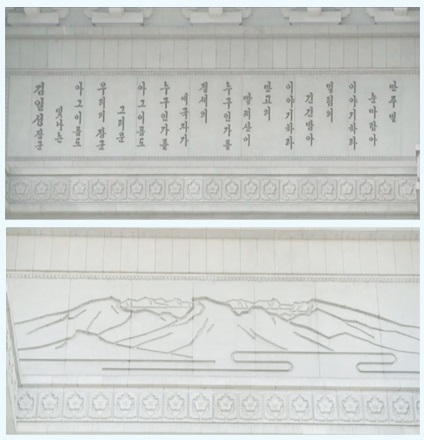 2階の前と後ろの面の中心には不滅の革命賛歌「金日成将軍の歌」が刻まれており、左と右の壁面にはペクトゥ山が描かれています。ペクトゥ山には抗日革命闘争を勝利へと導いた主席の栄光輝く革命活動の歴史が秘められています。