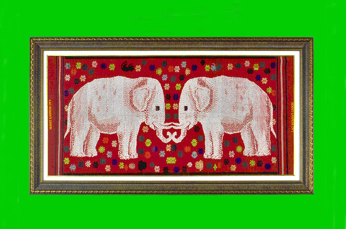昔からラオスでは大事な客に自製の手工芸品を贈る慣わしがあります。刺繍は、白い絹糸で2頭の象をデザインし、いろいろな色の絹糸で動植物の模様を縫い取っています。