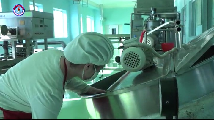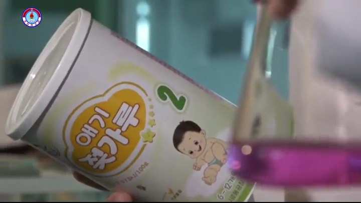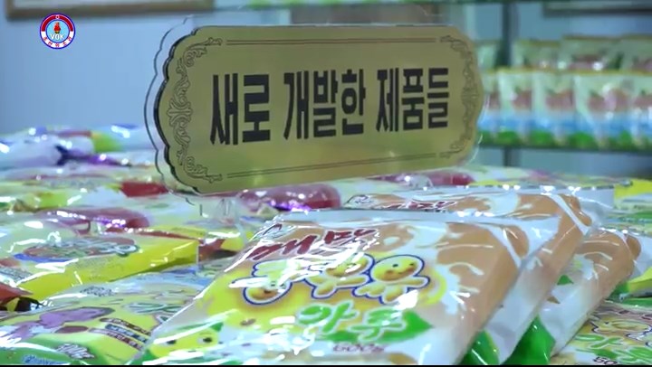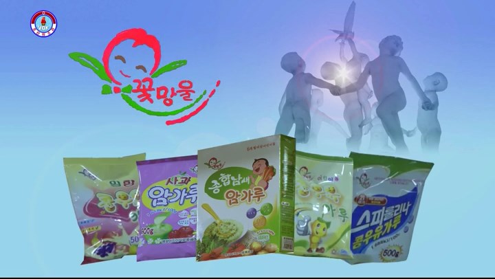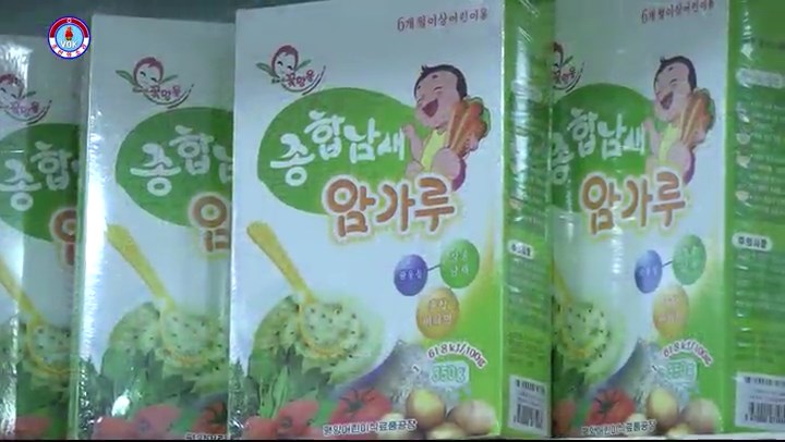 ここにあるのは平壌子供食品工場で生産される、蕾という意味の『コッマンウル』ブランドの食品です。工場では子供食品に含まれる炭水化物、蛋白質、脂肪等の栄養物質を最も合理的に調合し、その消化率を最大限に高めただけでなく、粉製品が水によく溶け安定が十分保たれる等品質改善でも一歩を踏み出しました。