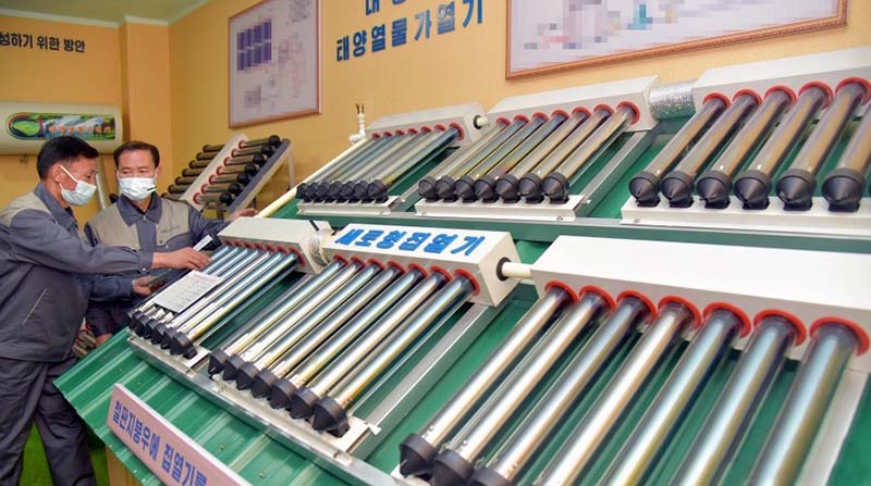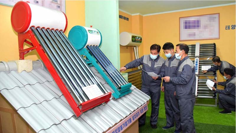 ピョンヤンのクァンボク通りにある太陽熱設備普及社では、太陽熱エネルギーの利用範囲を引き続き拡大しています。企業の建物自体が自然エネルギーを積極的に活用している省エネ型です。
