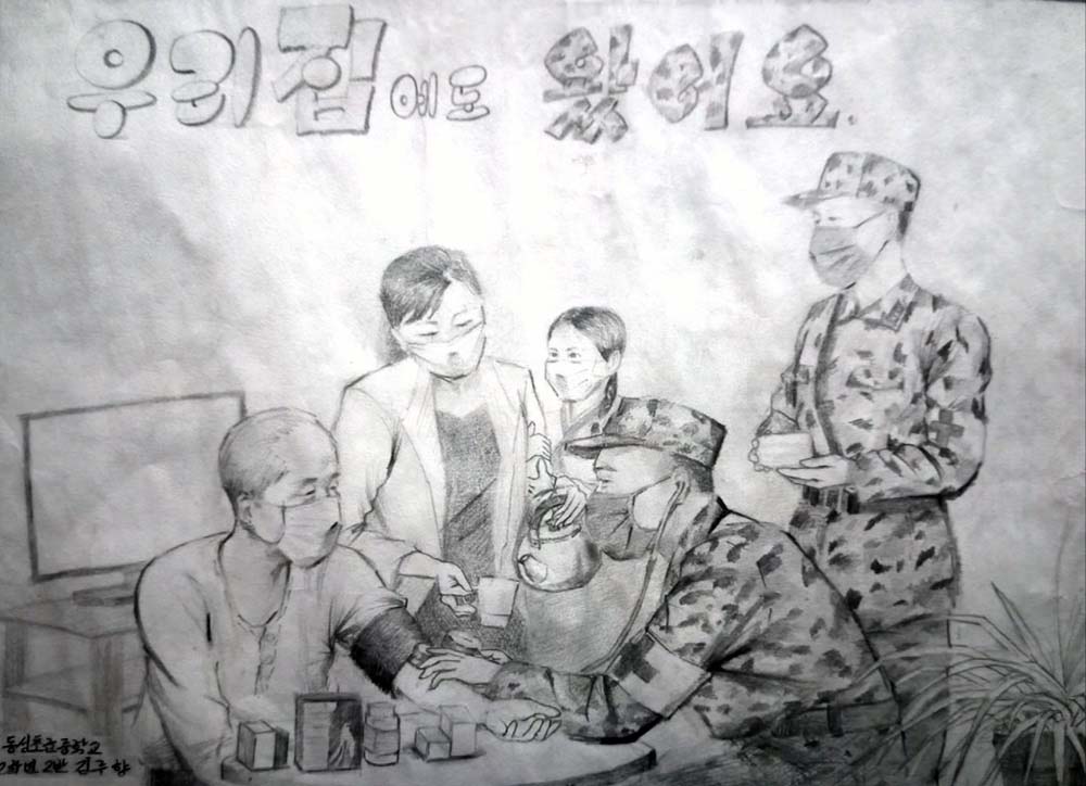 この5月、朝鮮労働党中央軍事委員会の特別命令によって、軍人たちがピョンヤン市内の薬局に派遣されてから、直接見聞きしたことを絵で表しました。夜更けにドアを引くのをためらってきびすを返すかも、と思って、外で住民を迎え入れたという話、夜を明かして患者の治療に真心を尽くしたという話、町の住民が届けた支援物資もそのまま送り返したという話などなど。毎日、絵を描いて、薬局の軍人たちに送りました。