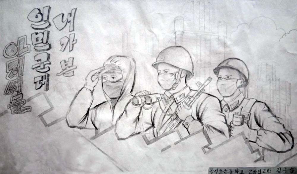 ピョンヤンのチュン区域医薬品管理所のソチャン分薬局で薬品を供給している軍人たちに、一人の少女から届いた絵が大切に保管されています。チュン区域*1トンソン初級中学校の2年2組に通うキム・ジュヒャンさんが描いた絵です。