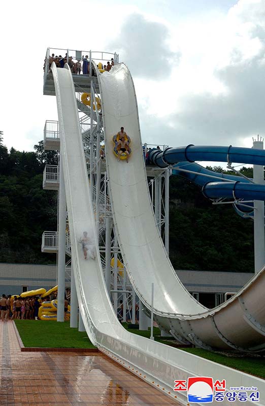 チュチェ101(2012)年7月24日、金正恩総書記は竣工を控えたルンラ遊泳場を訪れました。急流滑り台を見た総書記は、光センサーを取り付けて一人が殆ど滑り終ったときに次の人が出発するよう合理的な出発信号システムを立てるべきだと教えました。