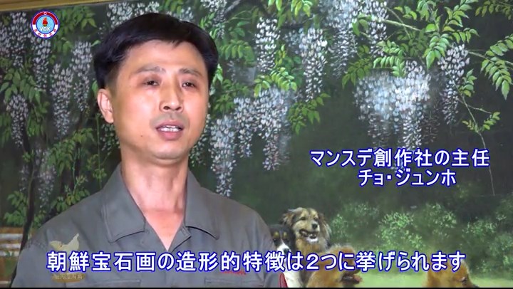 「朝鮮宝石画の造形的特徴は2つに挙げられます。1つは伝統絵画である朝鮮画の鮮明で繊細かつ簡潔な画法に基づいていることです。また1つは工芸の特徴があって、とても精巧なことです。対象の特徴によってカラー石の粉の粒度を変化させたり、象牙と貝殻、クリスタルのような天然の材料を加工して利用したり装飾の効果も出します。絵画の手法と工芸の手法を有機的に結びつけることによって、朝鮮宝石画は見るほど優雅な特有のイメージを与えています」