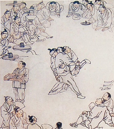 「朝鮮相撲についてはコグリョ、高句麗の壁画古墳と朝鮮封建王朝時代の絵画作品、そして色々な歴史記録を通してもよく知ることができます。朝鮮封建王朝時代の歴史記録によりますと、昔、朝鮮人民は仕事の休み時間に畑の縁で相撲を楽しみ、伝統の祝日には地元の風光に恵まれたところにある相撲場で子供から大人に至るまで勝負を競いました。たとえば、18世紀の朝鮮の有名画家であるキム・ホンド作の『相撲』を通しても準備が簡単でありながら、その枝が多様な朝鮮相撲は時と場所を選ばず楽しめる大衆向けの伝統の遊びだと言うことがよく分かります」