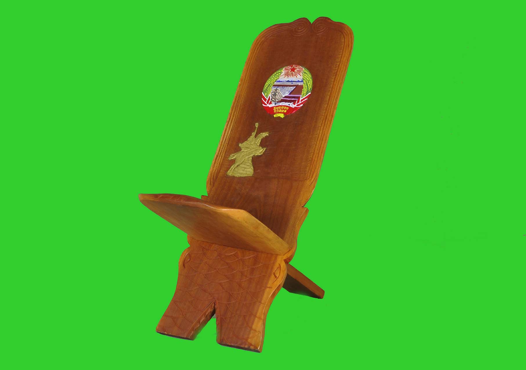贈り物はアフリカの高級木材であるマホガニーで作った組み立て式椅子です。紅褐色のマホガニーの材は耐熱性に優れ、重みがあって高級家具材に向いているといいます。椅子の背もたれには朝鮮民主主義人民共和国の国章と朝鮮人民の英雄的気概を象徴するチョンリマ銅像がデザインされています。