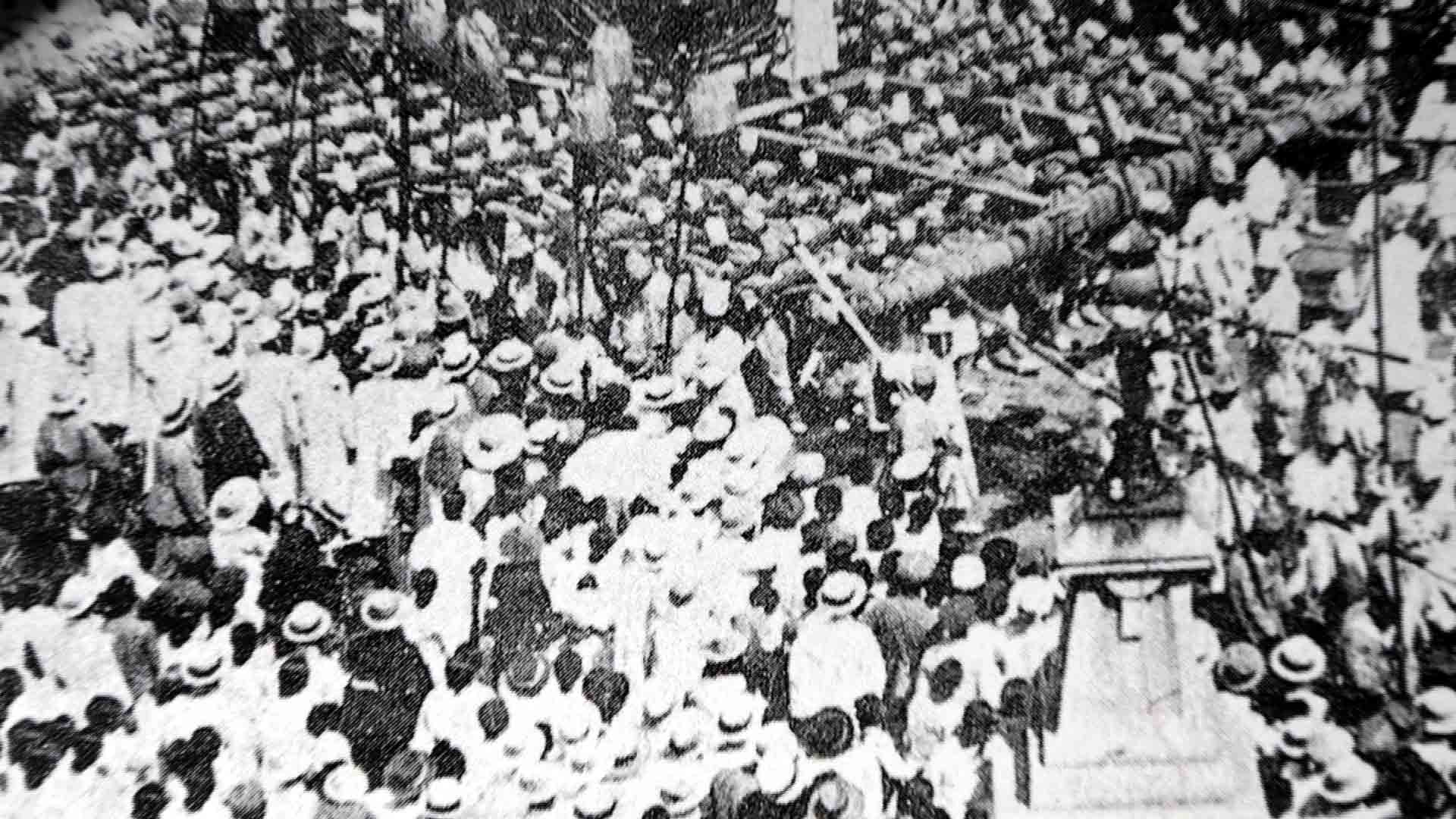 「1926年6月10日、キョンソンでは数万人の各階層の人が『朝鮮独立万歳!』、『日本軍は撤退せよ!』などと叫び、大衆的な反日示威を展開しました。日帝の『文化政治』の欺瞞さはこの6月10日万歳示威闘争を残酷に弾圧したことからもよく分かります。日帝は、4000人以上の騎馬警官と数百人の憲兵を示威の弾圧に動員し、丸腰の示威参加者に銃砲を発砲しました。そのため160人余りが怪我をし、200人余りが逮捕されました。日帝はキョンソンだけでなく、各地方での大衆的な示威も残酷に弾圧しました。6月10日万歳示威闘争に対する日帝の弾圧は当時、日帝が実施した『文化政治』の狡猾さと悪辣さを白日の下にさらけ出しました」