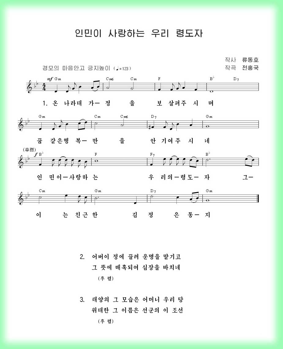リュ・ドンホ*1作詞、チョン・ホングク*2作曲の「人民に愛されるわれらの指導者」、この歌はチュチェ101(2012)年に出ました。敬愛する最高指導者金正恩委員長を敬慕してやまない朝鮮人民の熱い思いを歌い上げています。