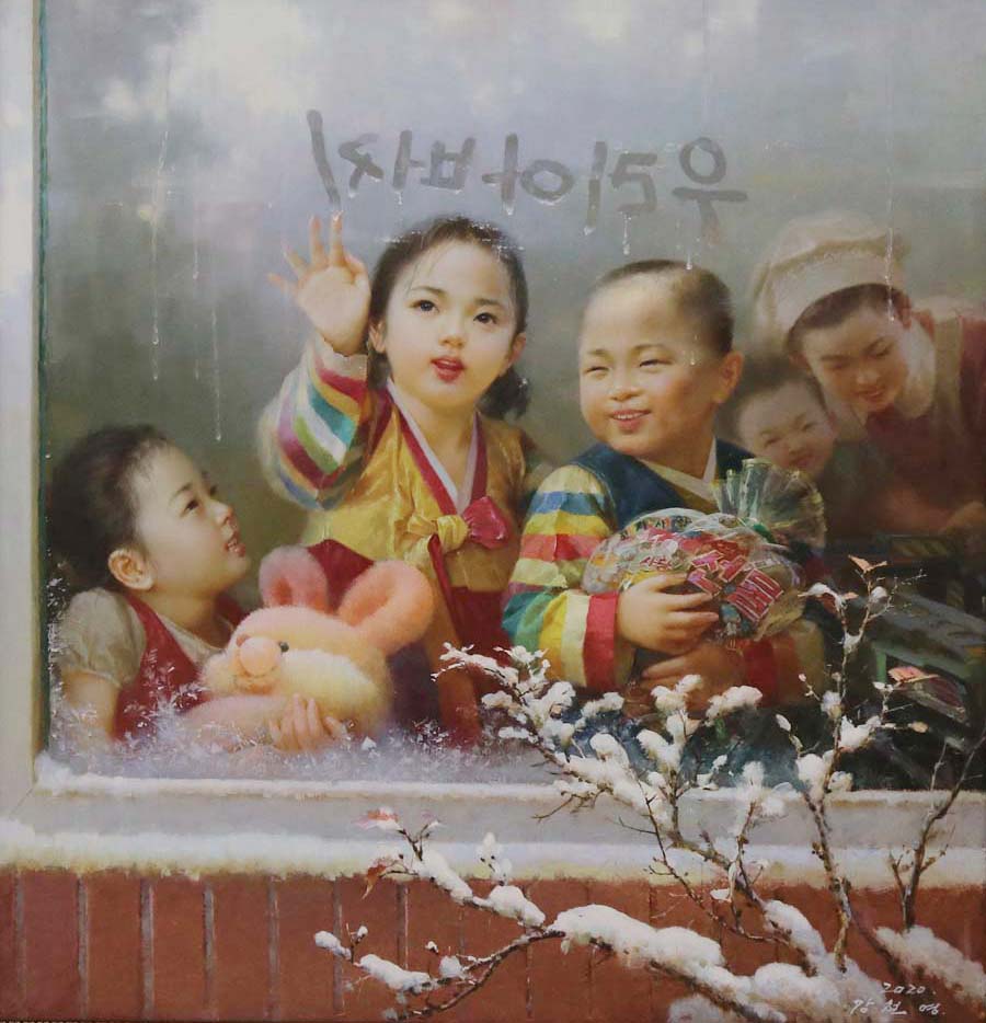 油絵「私たちの父」はピョンヤン愛育院の子供たちを表しています。元日の朝、敬愛する金正恩総書記の恩愛が宿る贈り物をもらって喜ぶピョンヤン愛育院の子供たち。