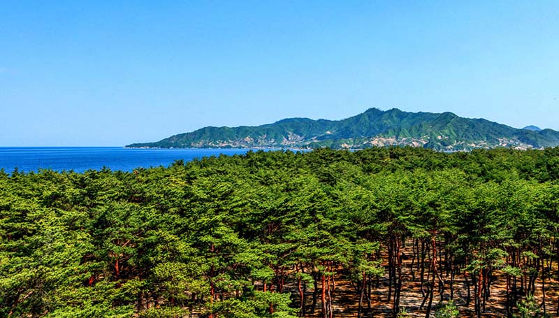 ハムギョン南道*1リウォン郡*2の東部に面した海辺に行くと、100メートル幅の8キロを超える区間に広がる鬱蒼たる松林があります。ここは朝鮮人民の間に広く知られた海辺の名勝であるソンダンというところです。