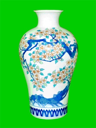 佐賀県有田の有名な陶芸家に特注して作ったものです。あさぎ色を地色にして満開になった桜の木を描いた焼き物の花瓶は高さ32.5センチメートル、胴体の直径は18センチメートルです。