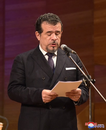 開催式で、国際審査員のオーストリアのザルツブルグ・モーツァルト音楽大学のディアズ・ワラス・マリオ・アントニオ教授が祝辞を述べました。教授は、第1回ピョンヤン国際声楽コンクールが成功裏に開催されるよう深い関心を払った尊敬する金正恩元帥に心からの感謝を表するとし、うららかな春の季節に朝鮮民主主義人民共和国の首都ピョンヤンで各国の声楽家が参加する国際的なコンクールが開催されるのをとても嬉しく思うと述べました。