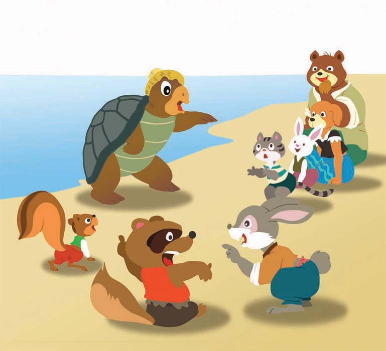 亀を囲んだ小さい動物たちは初めて見る亀を怪訝に思い、亀のお爺さんて聞いたことがないと言いました。