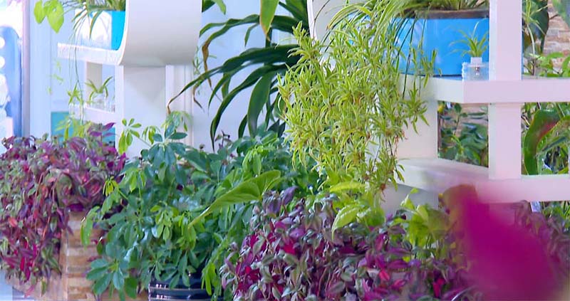 「室内にこのように色々な植物を調和が取れるよう配置しますと、空気の浄化にも大分良く、またインテリアの効果も大きいと言えます。建物の内部のスペースの隅々を効果的に利用して、植物そのものの模様と自然美が生かされるよう配置しました。鉢植えを並んでおくか、または垂直に吊り下げる、そして垂れ下がったものにしたり、水耕栽培したりなど、まあ、いろいろな方法で栽培しています」