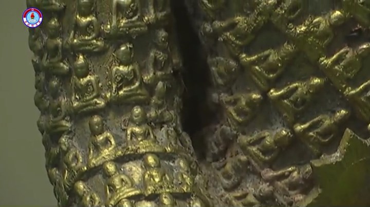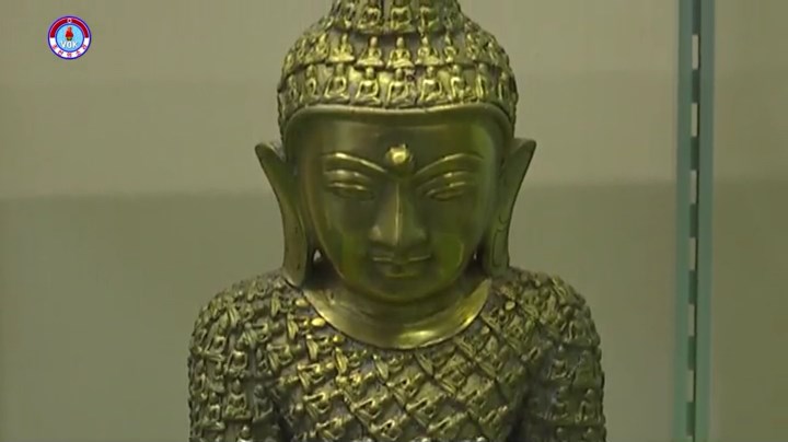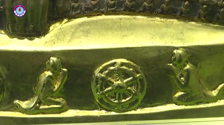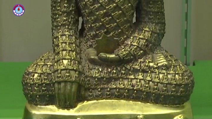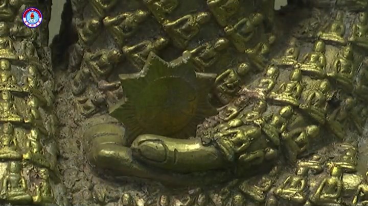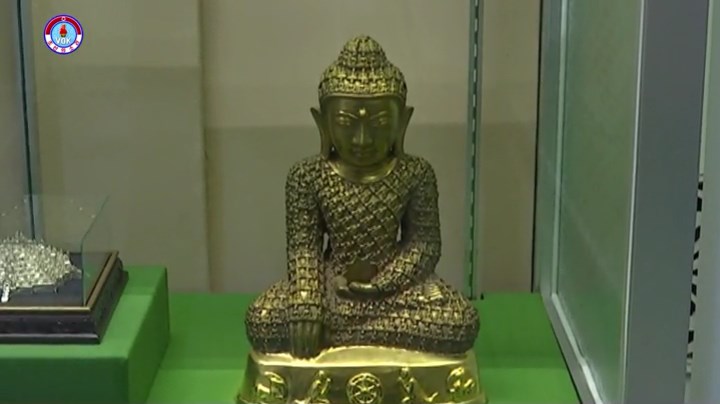 釈迦牟尼を表わしたこの金の仏像は1994年、ミャンマーで発掘された19世紀の歴史遺物だといいます。金の仏像の表面には数百個の小さな仏像が刻まれており、釈迦牟尼の左手には9角から成る星があります。仏像の下の部分は純金から成っており、前面の真ん中には操舵*1を中心に敬意を表する二人の人がデザインされています。