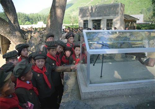 当時のピョンヤン第1中学校の生徒からなる革命戦跡地行軍隊を率いて、主席の革命業績が秘められている抗日の戦場を訪れて、血みどろの抗日の日々に生まれた革命伝統の偉大さと必然的にそれを受け継がなければならないという事を痛感した総書記でした。