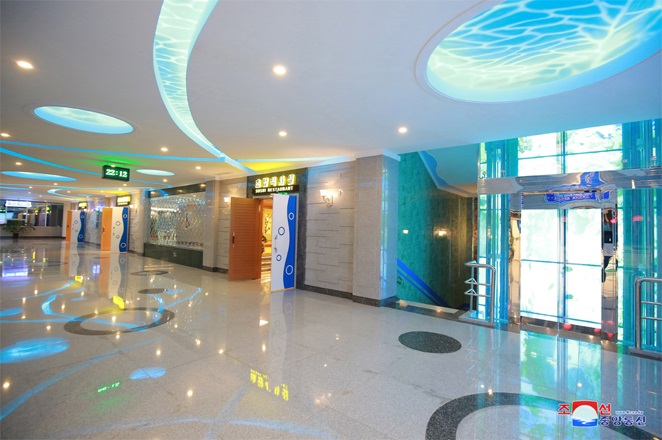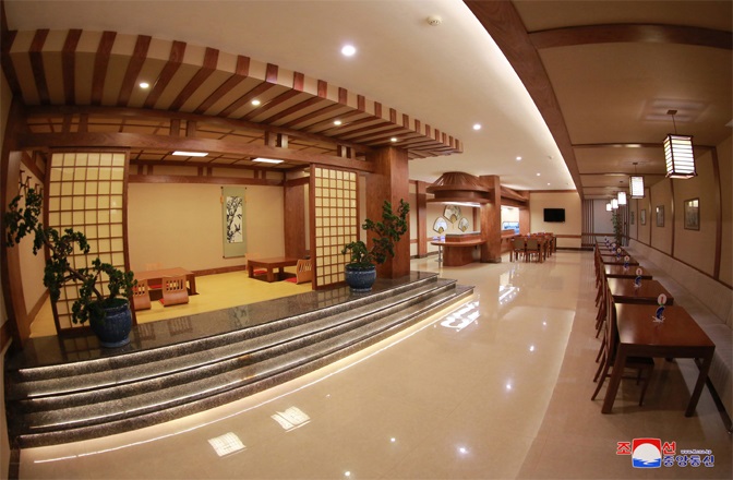 チュチェ107(2018)年6月のある日、敬愛する最高指導者金正恩委員長は新築されたピョンヤン・テドンガン水産物食堂を訪れました。そして、食堂建設のデータを見て、設計と施工の質が高いと評価したが、実際に来て見ると、本当に素晴らしくユニークだと言って、「ピョンヤン・テドンガン水産物食堂」と名付けました。