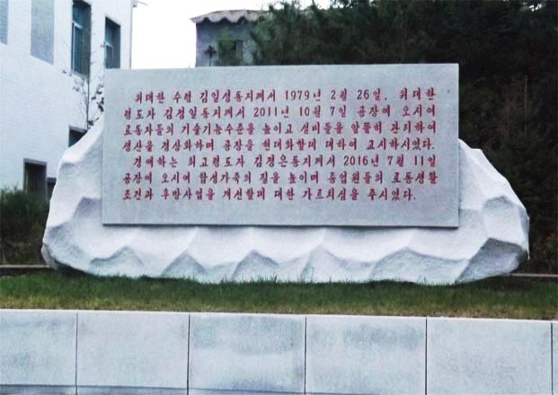 「金正恩委員長は革命指導で多忙な中、猛暑もいとわず工場を現地指導しました。この日、金正恩委員長は主席と総書記の現地指導の標識碑を見て、新築された革命事績教育室と沿革紹介室も見ました。金正恩委員長は革命事績教育室にかけてある主席と総書記の写真に見入り、工場に秘められた主席と総書記の不滅の指導の業績について感慨深く思い起こしました。そして貴重な写真をよく保存したと言いました」