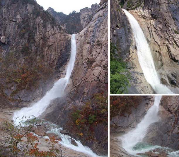 切り立った崖から水しぶきをあげながら流れ落ちる滝は、白の絹地を垂らしたようです。滝の落差は74メートル、幅は4メートルです。滝つぼをクリョンヨン*3と呼び、深さが13メートルもあります。九匹の竜がクムガン山を守ったと言う伝説から九竜の滝、クリョンの滝、九竜淵、クリョンヨンと呼ばれます。