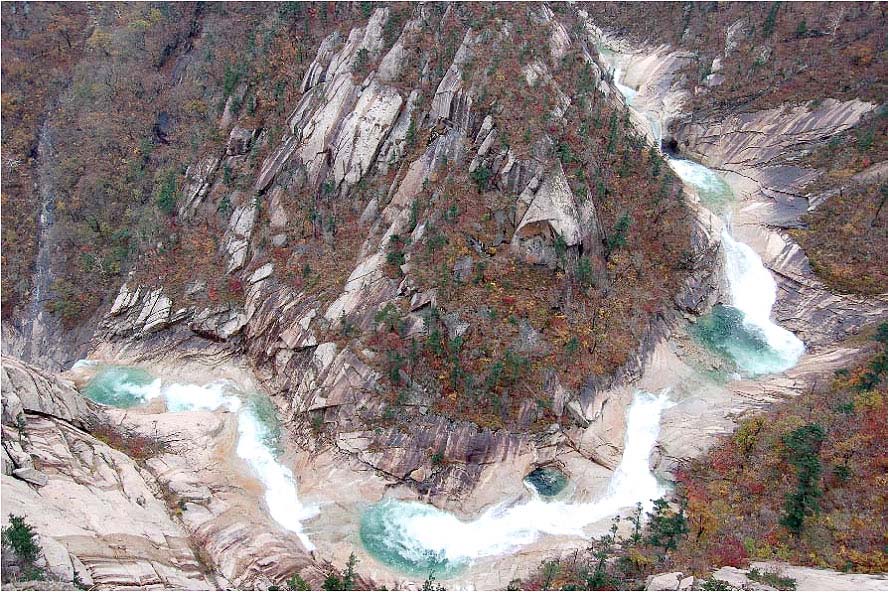 クリョンの滝の上の渓流には、数珠つなぎになっているエメラルド色の八つの潭があり、これをサンパルタム*4と呼んでいます。サンパルタムのサンは上、パルは八、タムは潭(ふち)ですが、水の深い所、池のようになった所ですが、池と違うのは、水の流れる所に池のように深く広がった所なのです。