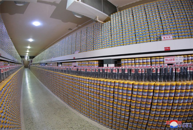 人民に様々な塩辛の加工品を供給できるのが本当に嬉しく、満ち足りた気持ちなので、一幅の絵のような、ぎっしりと積まれている製品に長いこと見入りながら、やすやすと貯蔵庫を離れられない金正恩委員長に周りの人たちは深い感動を覚えました。