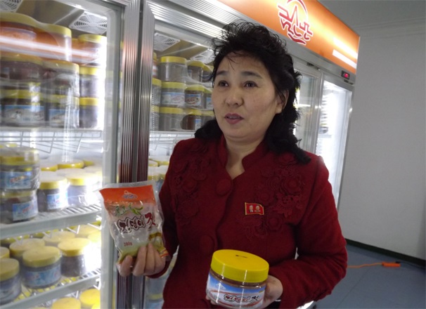 「弊店はクムサンポ塩辛加工工場で生産される各種塩辛の専売店です。クムサンポの塩辛加工品は風味と栄養学の面での効果大で、とても評判です。中でも人気が上がるのはアミ類の塩辛です。青唐辛子とニンニクなどアミに他のものを混ぜていろいろな塩辛を作りましたが、それぞれ独特の風味がありますね。分けても青唐辛子を入れたアミの塩辛は唐辛子とアミの自然の味が見事に調和して食欲をそそるといって、誰もが好んでいます」