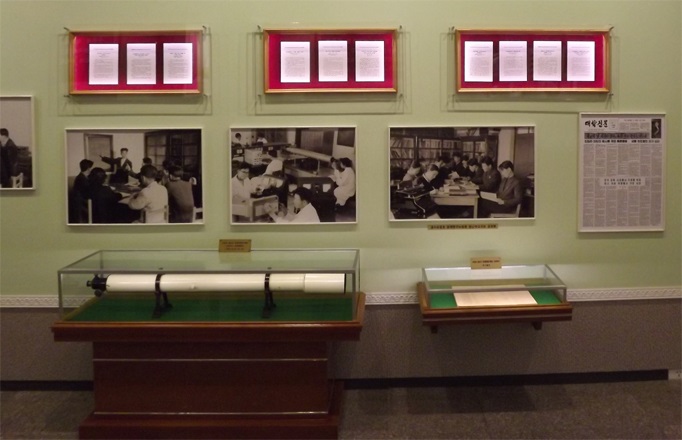 事績館には、総書記が大学内に党の唯一思想体系を確立した資料と教育に主体性を確立するよう導いた資料、学生たちを労働を通して革命的に鍛えるようにした資料、学生たちの大衆文化・スポーツ活動を指導した資料、そしてオウンというところで軍事活動を行った資料が展示されています。