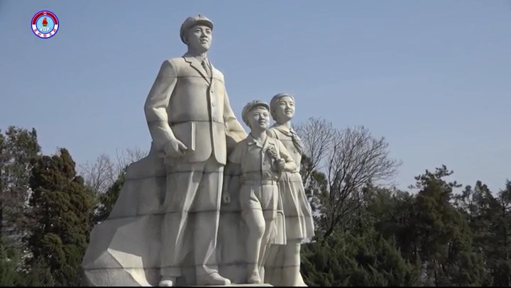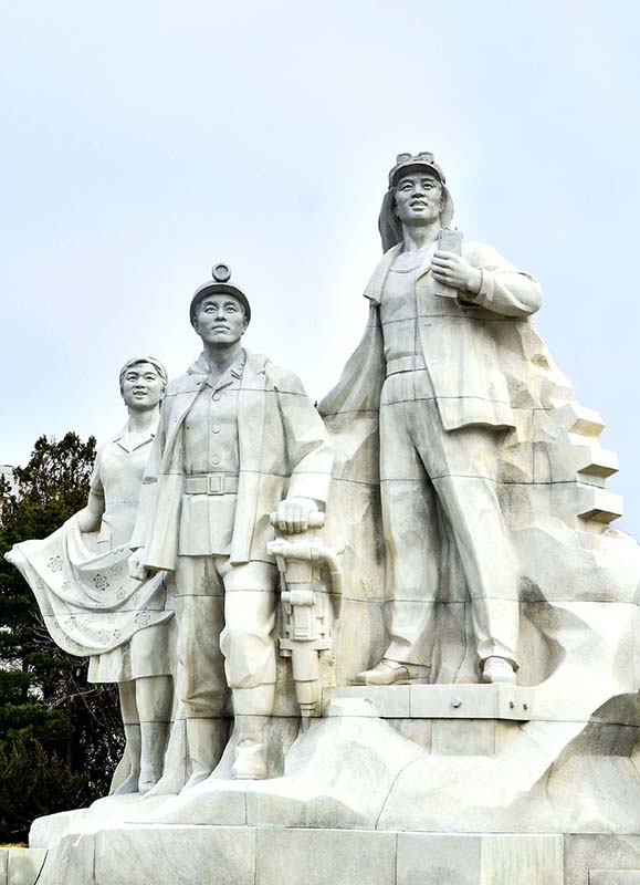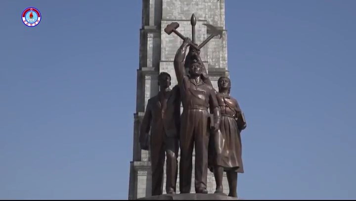 チュチェ思想塔の前に塔のテーマとなる群像が建てられています。労働者と農民、知識人が掲げたハンマーと鎌、筆はそのまま党のマークをなして、朝鮮労働党を表しています。