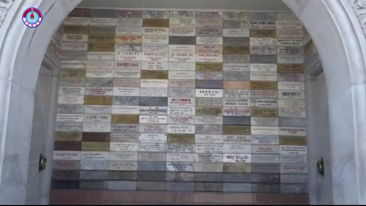 チュチェ思想塔の基壇の後ろには100数カ国の元首と政界・社会各界の著名人、国際機構、チュチェ思想研究組織から贈られた300個余りの記念の石材が貼られています。